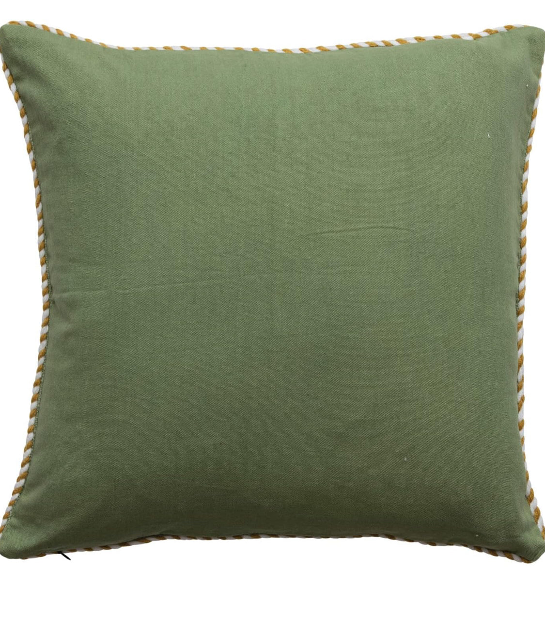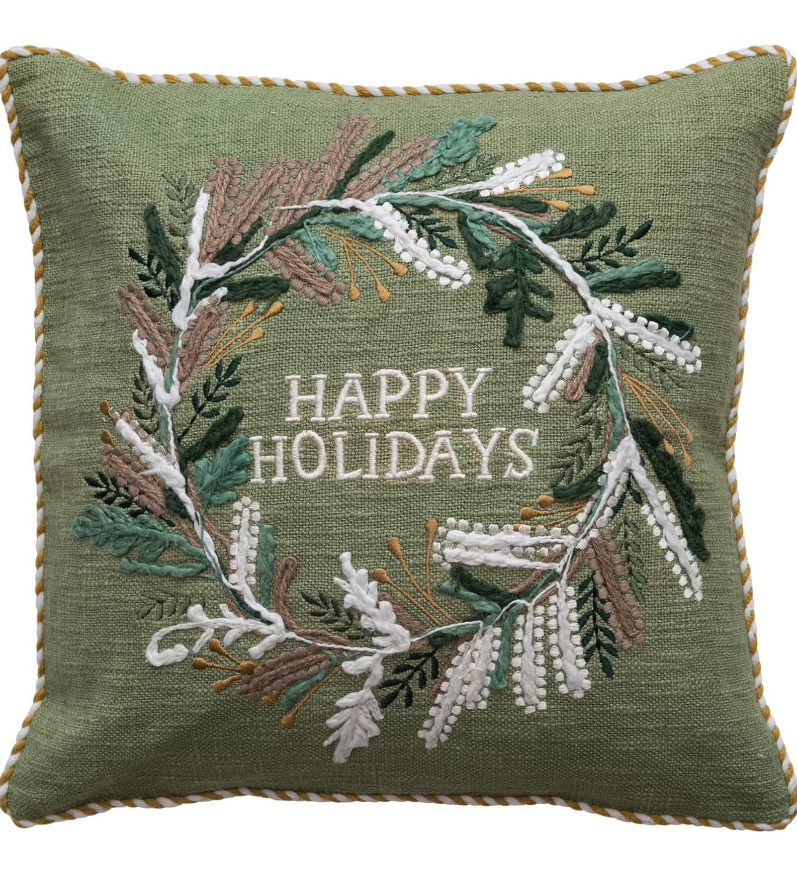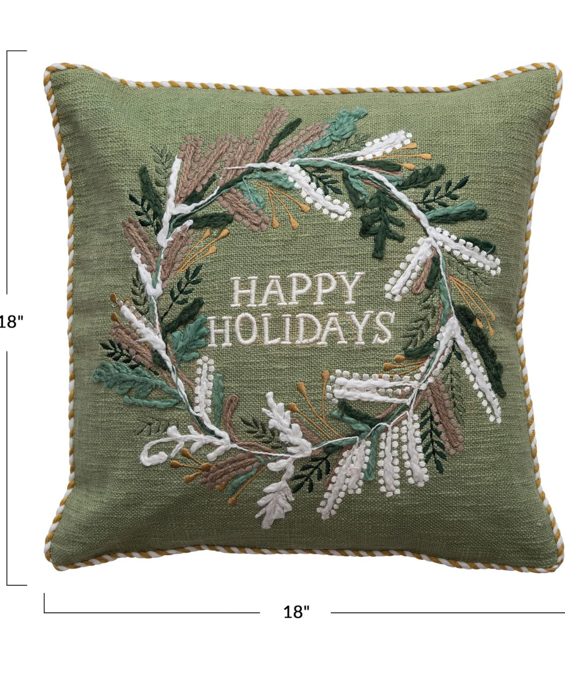 18” Square cotton Pillow w/Wreath, Embroidery & Piping