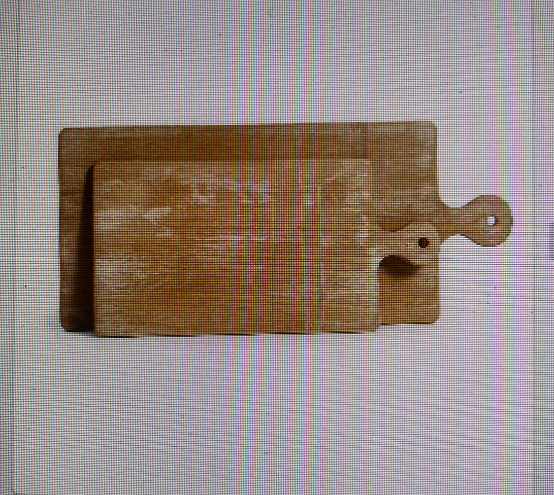 Inlaid wood detail and a warm gray wash make these cutting boards particularly special. Leaning against a black splash or hung on the wall, a traditional look for a kitchen or dining room. Clean with dry cloth, avoid harsh chemical. For interior use only.