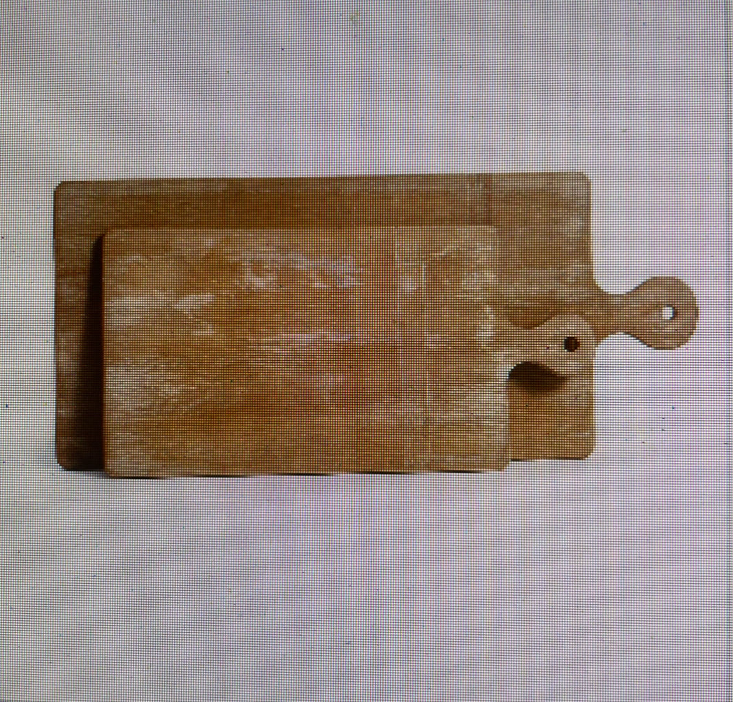 Inlaid wood detail and a warm gray wash make these cutting boards particularly special. Leaning against a black splash or hung on the wall, a traditional look for a kitchen or dining room.