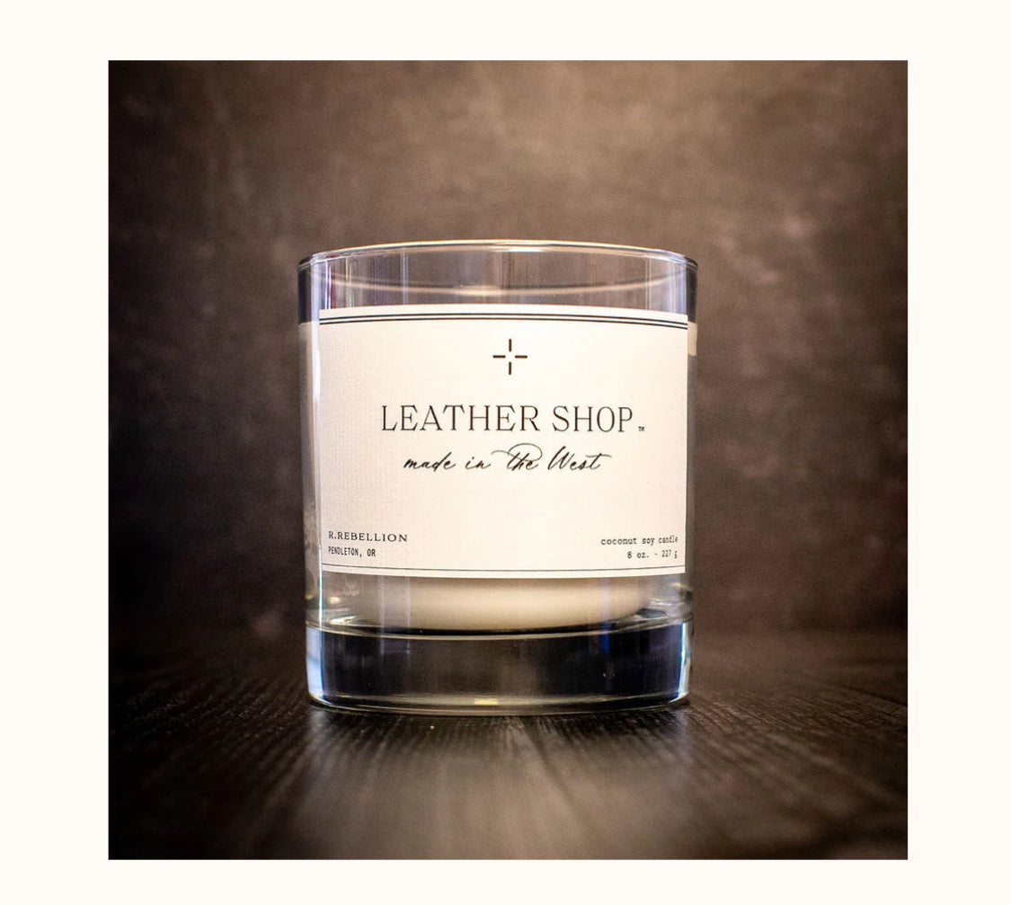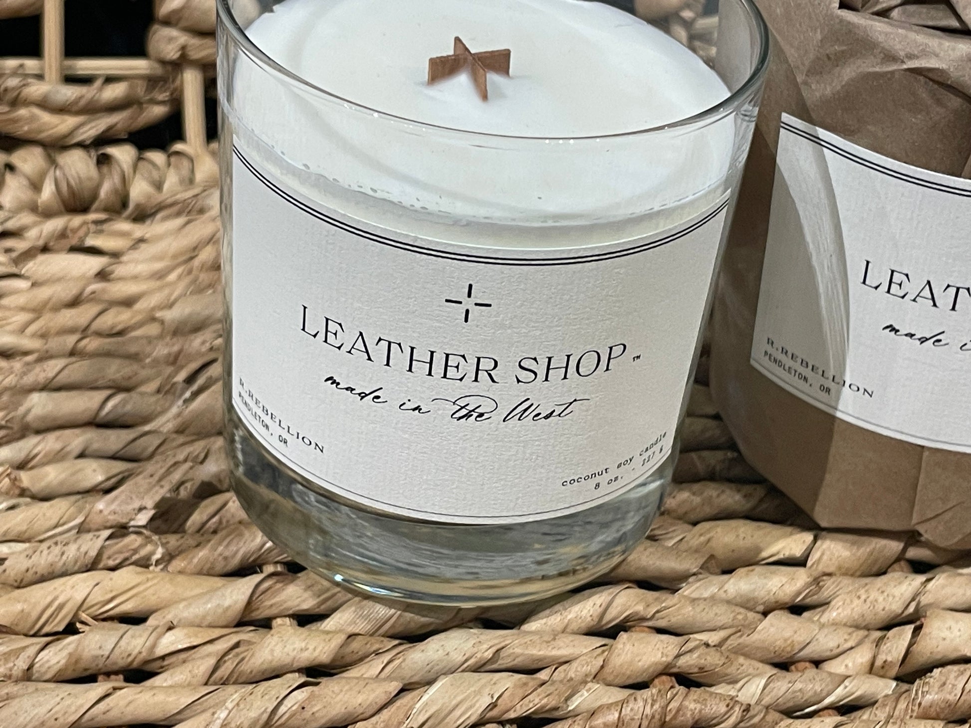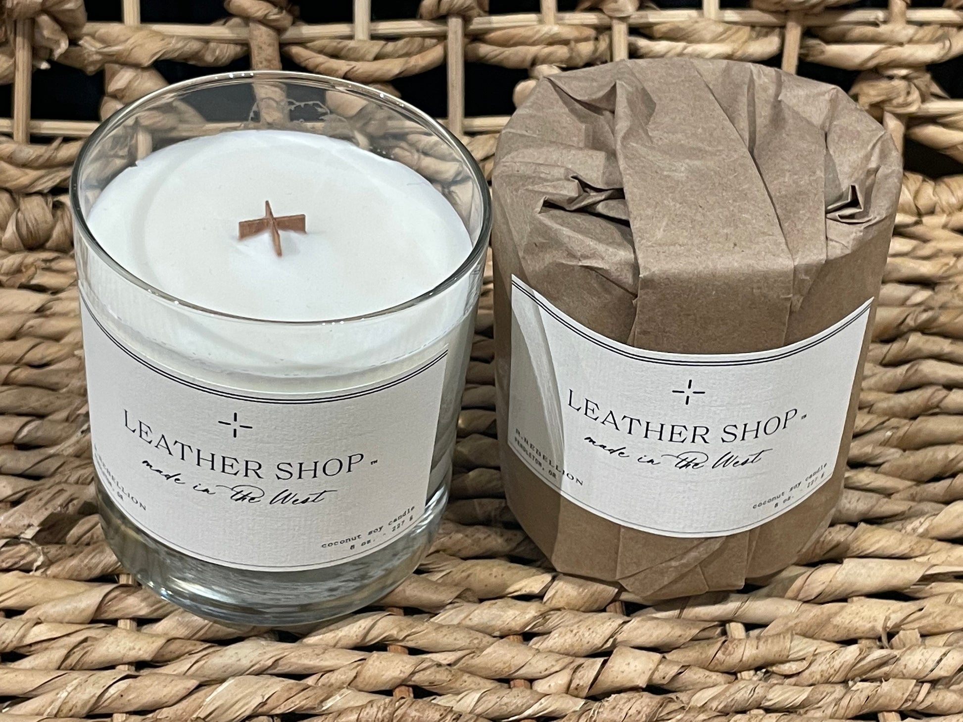 Coconut soy candle, 8oz, wood wick- leather, lemon, mandarin, patchouli, frankincense. Burns up to 60 hours. Vessel: Reusable whiskey glass