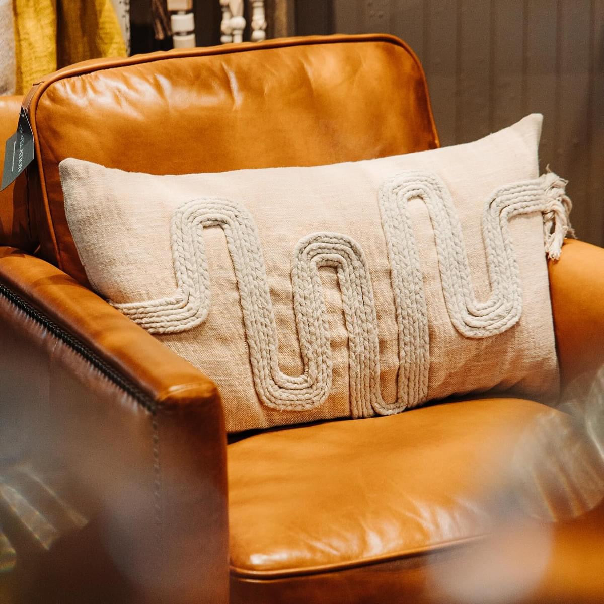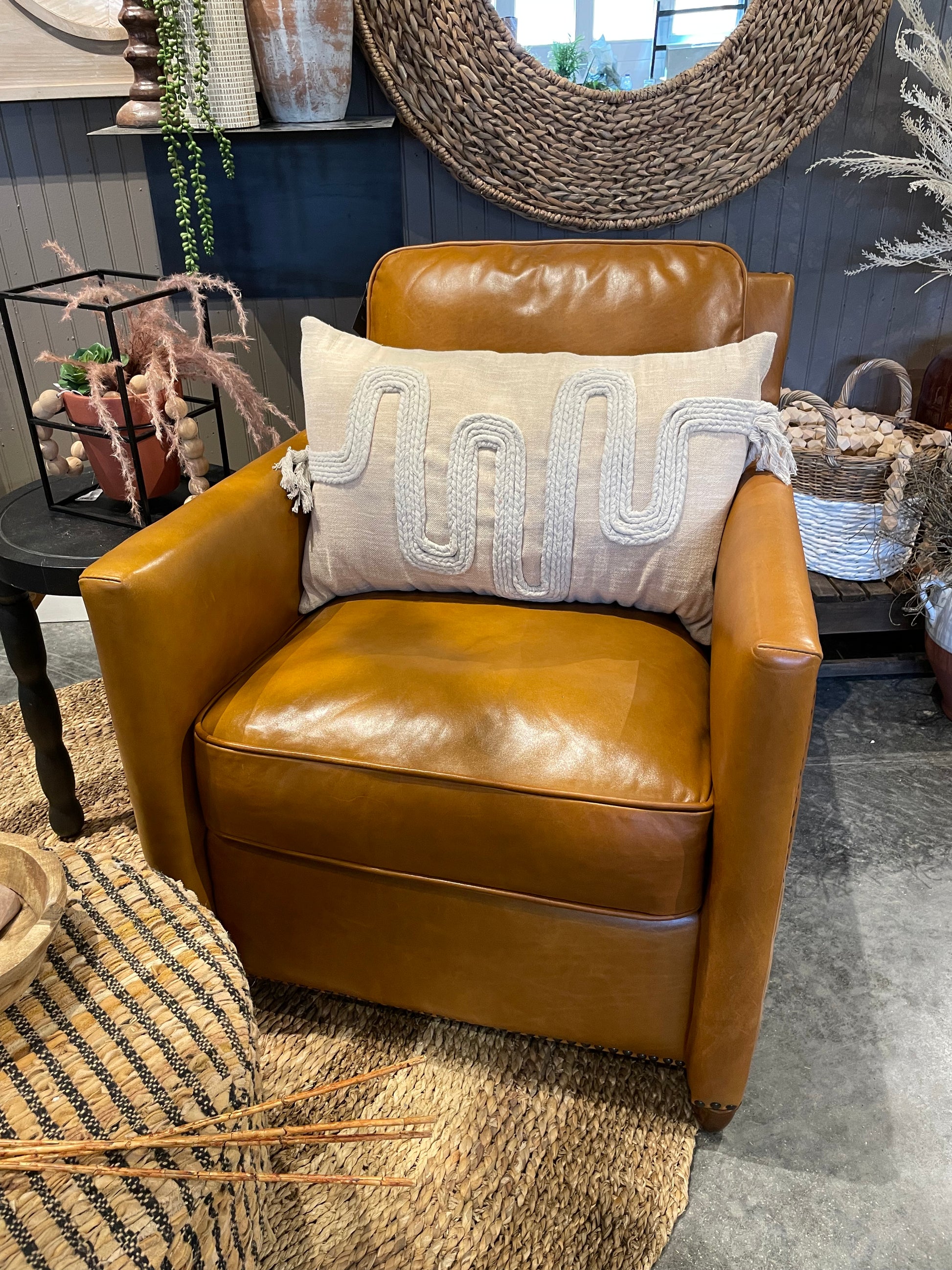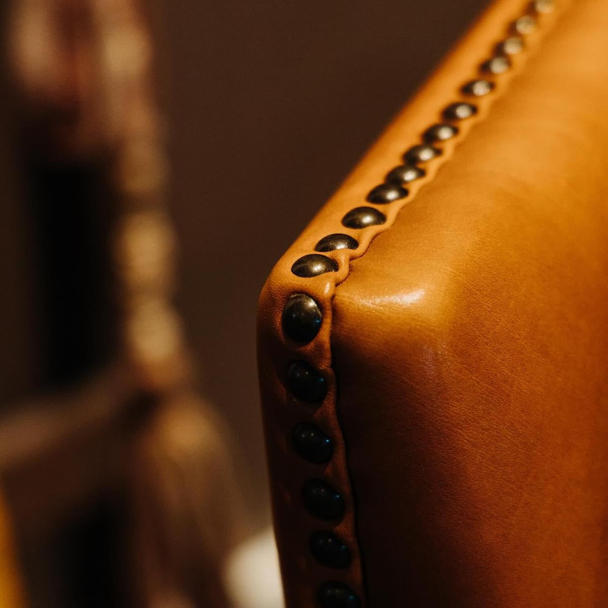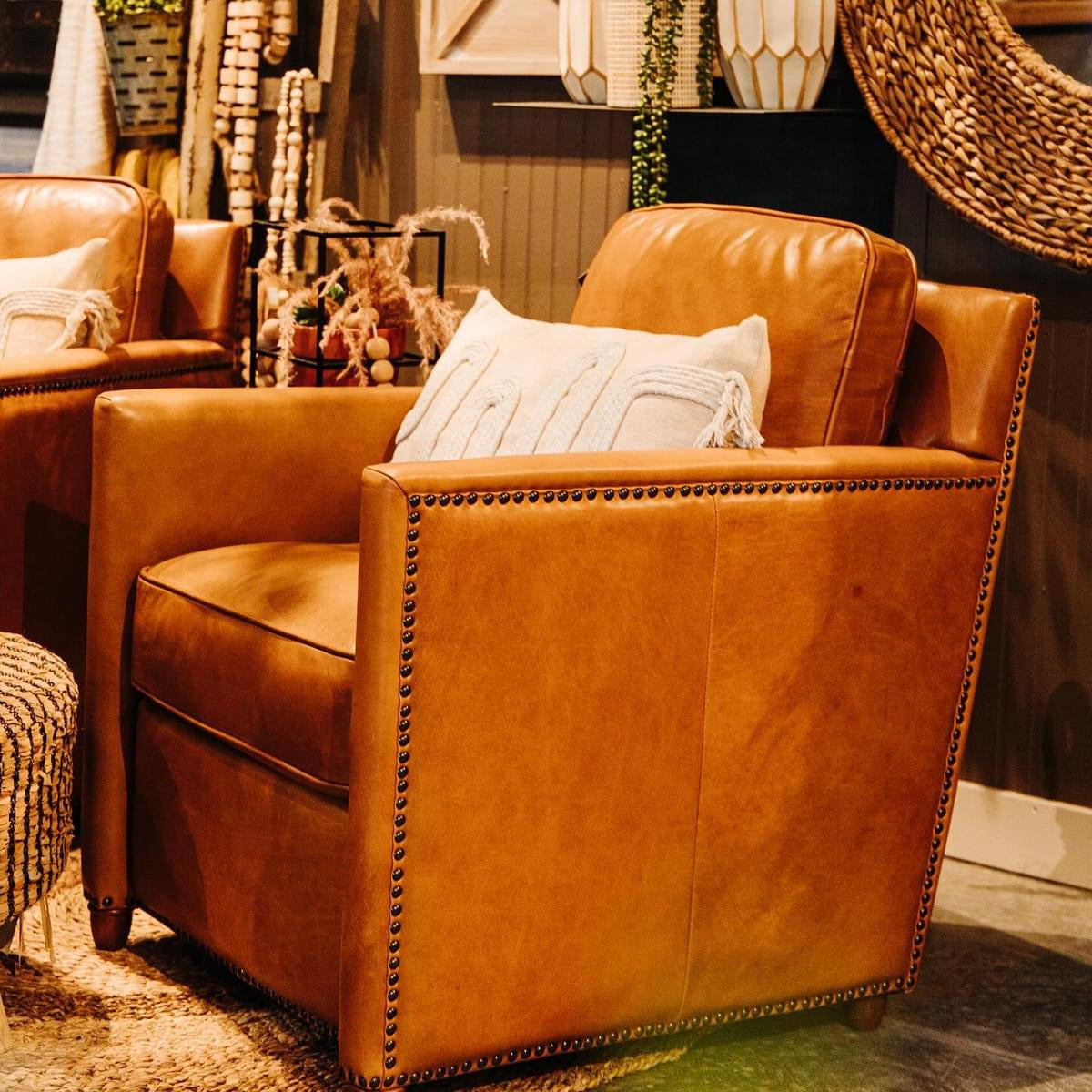 Classic Parisian club chair, with comfortable box cushions and birch frame, featuring character distressed, full grain leather in worn cognac with complementary antique bronze nail head trim. Because leather is a natural product, both texture and color will vary slightly, enhancing leather’s uniqueness. Seat height is 19”.